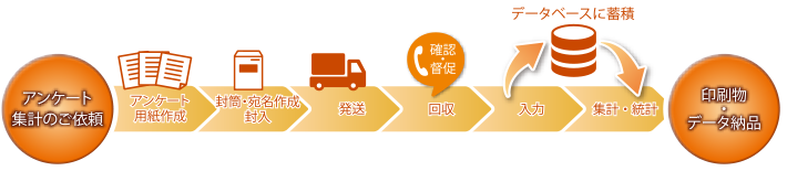 アンケートを実施するには、発送業者や入力業者、分析業者、印刷物作成業者など、実に様々な業者への手配が必要になります。『アンケート業務サービス』は、これらの悩みをワンストップで解消するサービスです。アンケートの発送から回収、データベース化による集計、納品までのすべての工程にて、貴社の業務の煩わしさを解消します。